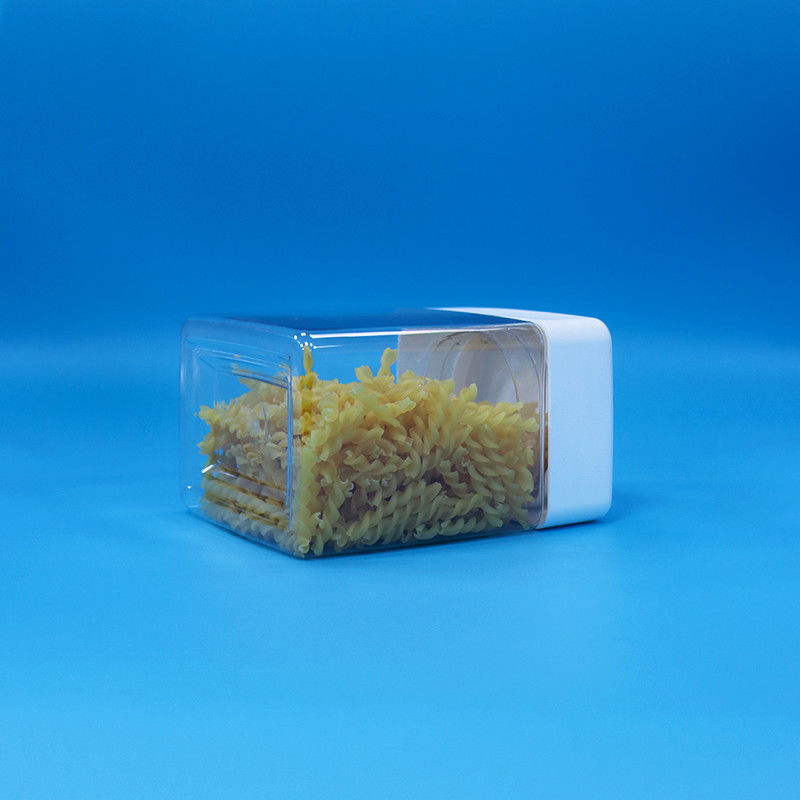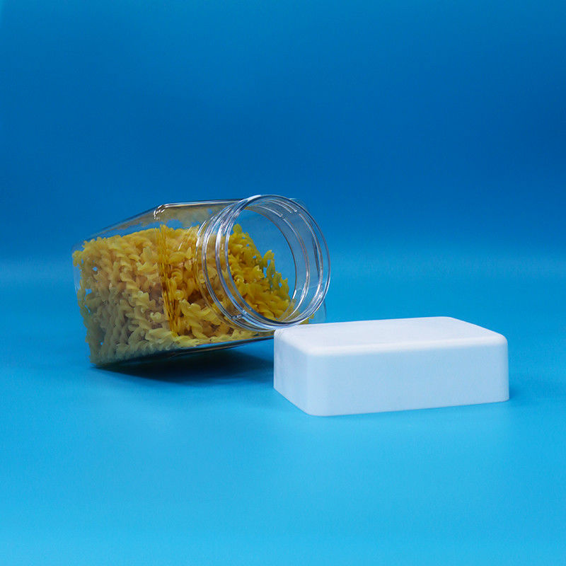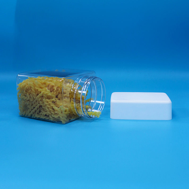 PET Şekerleme Atıştırmalık Plastik Gıda Sınıfı Şeffaflık Kare Kavanozlar Döşeme Yukarı Beyaz Kapaklar